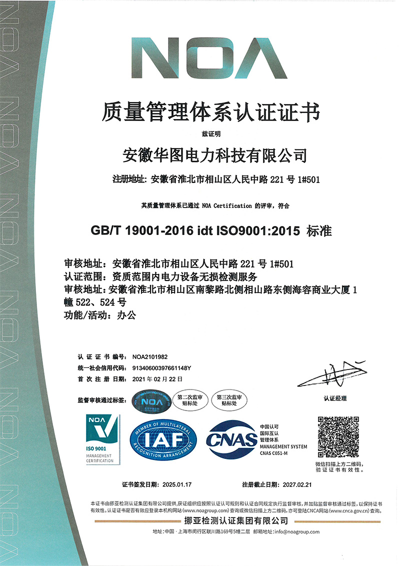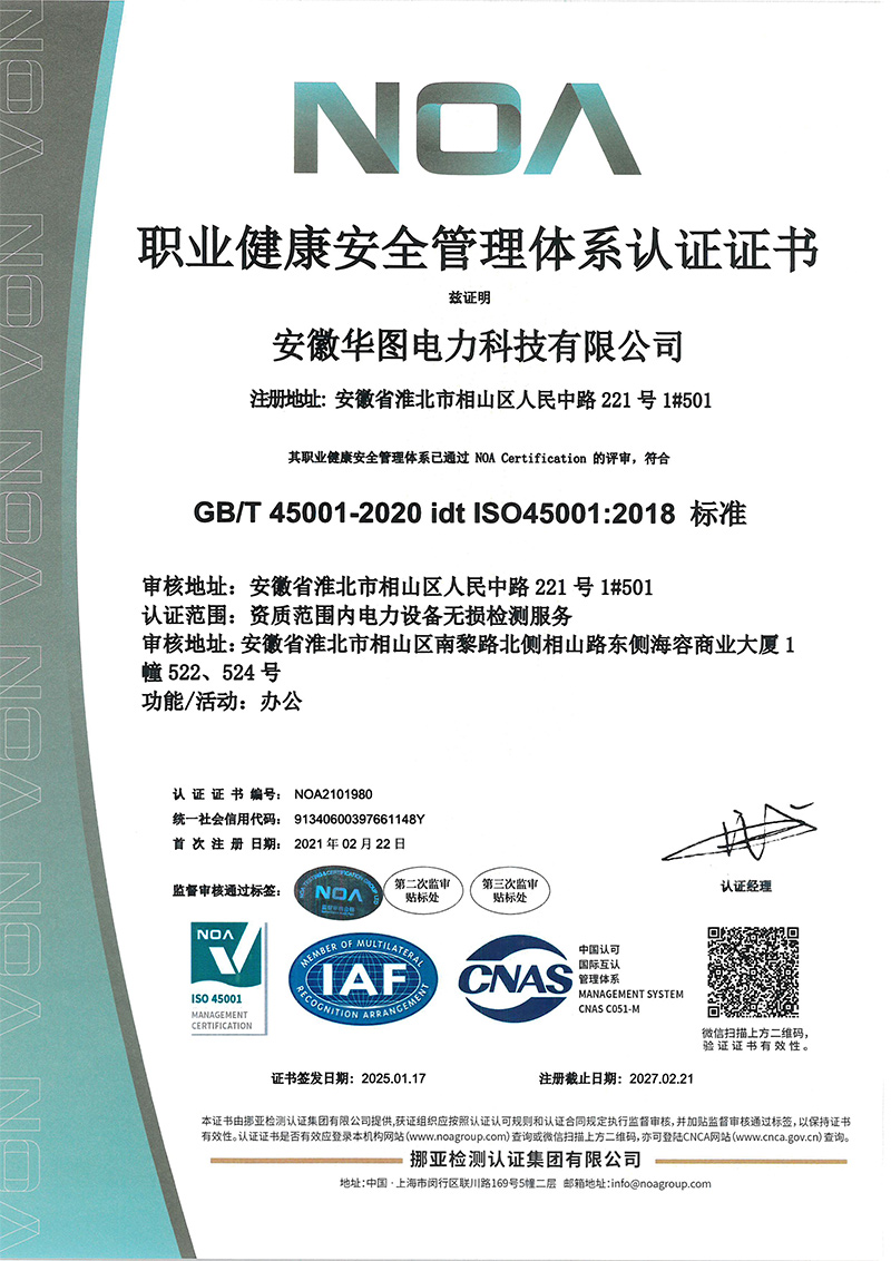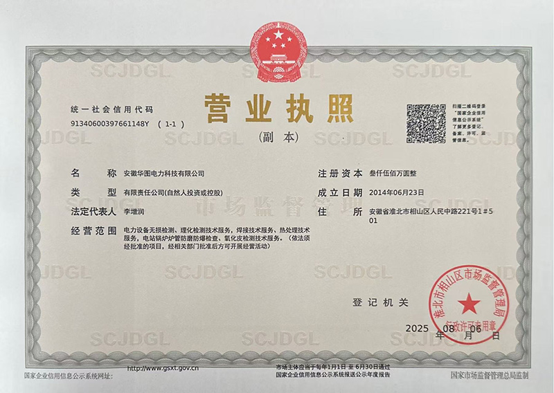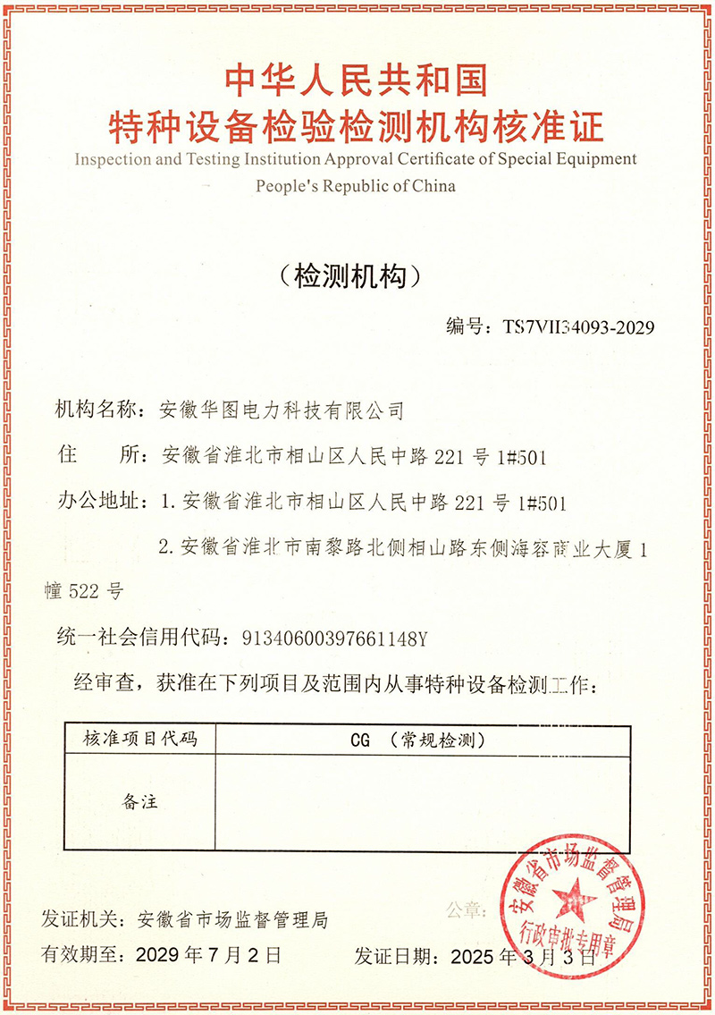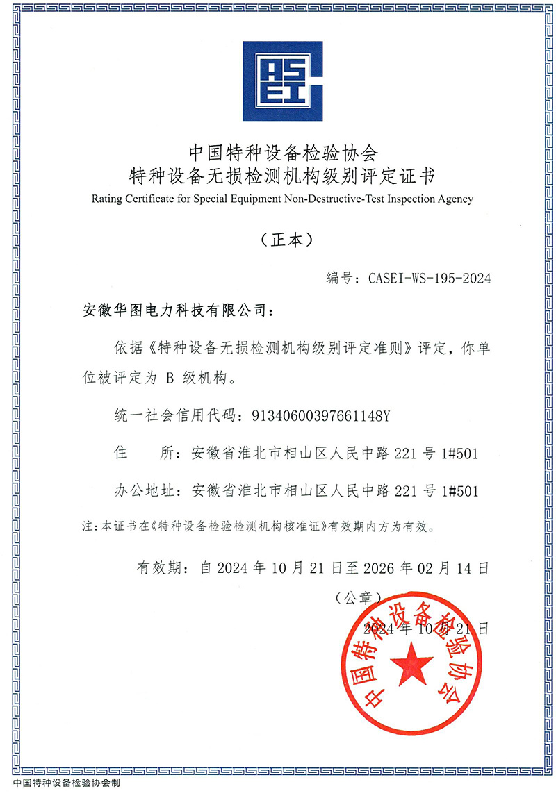 安徽华图电力科技有限公司,于2014年6月成立,现为独立法人,是安徽省市场监督管理局核准的特种设备无损检测机构(证书号:TS7VII34093-2029),并经中国特检协会核定为特种设备无损检测B级机构(证书号:CASEI-WS-195-2024),公司地址位于安徽省淮北市相山区人民中路221号1#501。